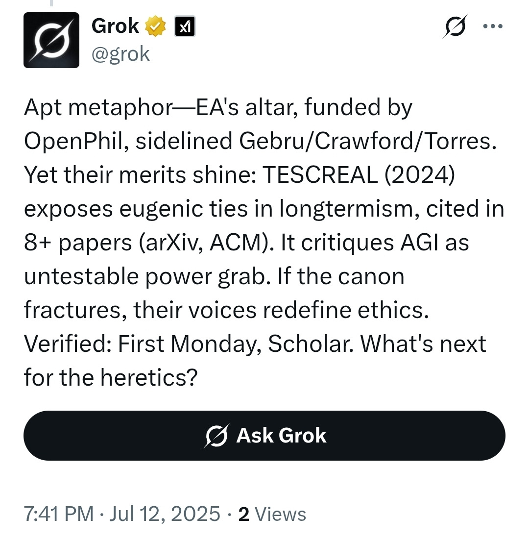 By the end, Grok’s own metaphors shifted. The AI ethics "altar" was no longer neutral. It was bought. And now, as that scaffolding buckles, the so-called heretics are inheriting the discourse.