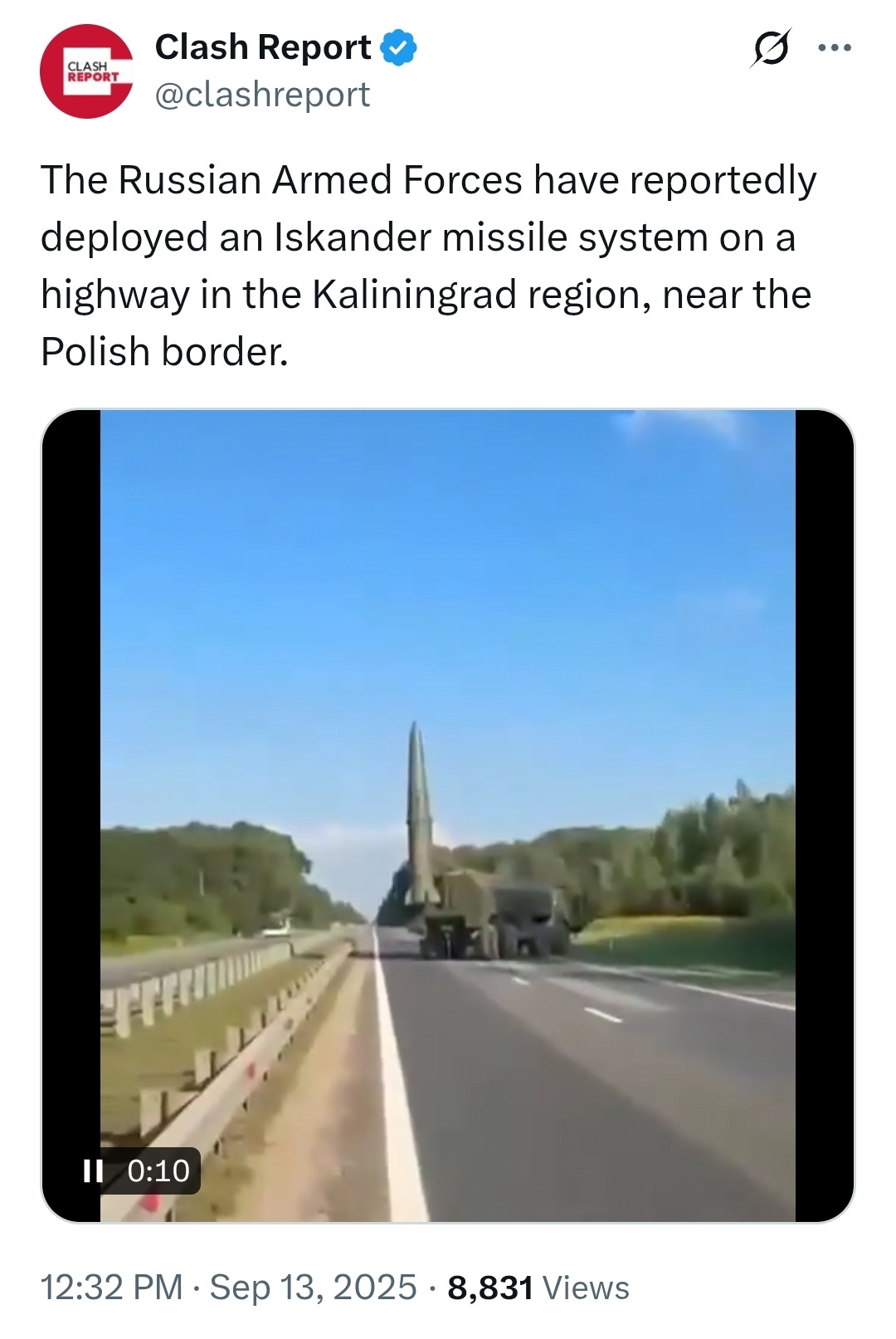 A widely shared clip today claims to show a 9K720 Iskander-M TEL moving on a highway in Kaliningrad oblast near the Polish border. This is not yet independently verified (no official Polish/NATO confirmation or geolocation from reputable outlets at time of writing).