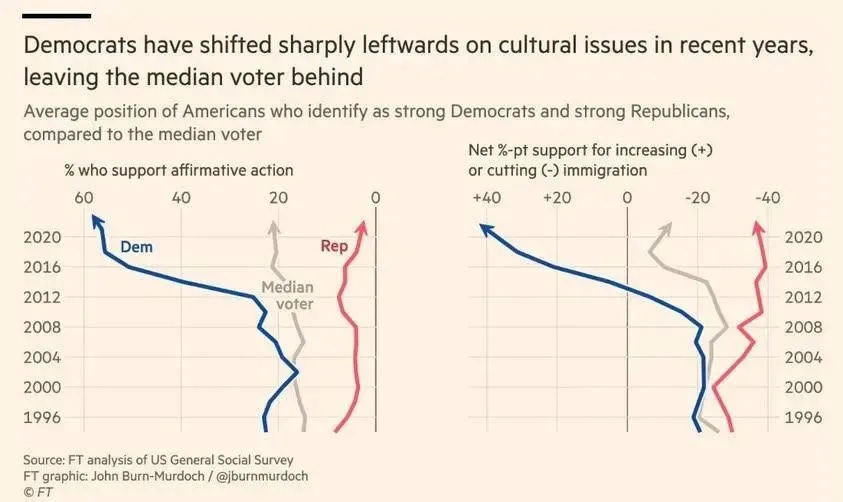 The headline says: “Democrats have shifted sharply leftwards on cultural issues in recent years, leaving the median voter behind.”