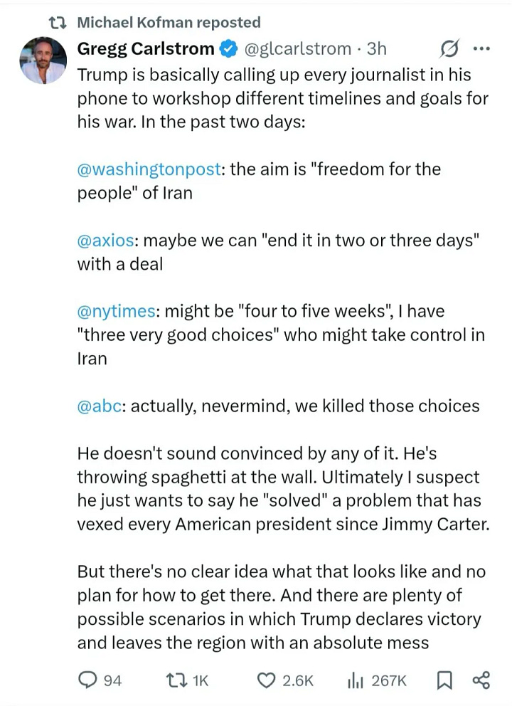 Gregg Carlstrom, a Middle East correspondent whose thread was reposted by the military analyst Michael Kofman, put it plainly: Trump is throwing spaghetti at the wall. He just wants to say he solved a problem that has vexed every president since Carter. But there is no clear idea of what “solved” looks like and no plan for getting there.