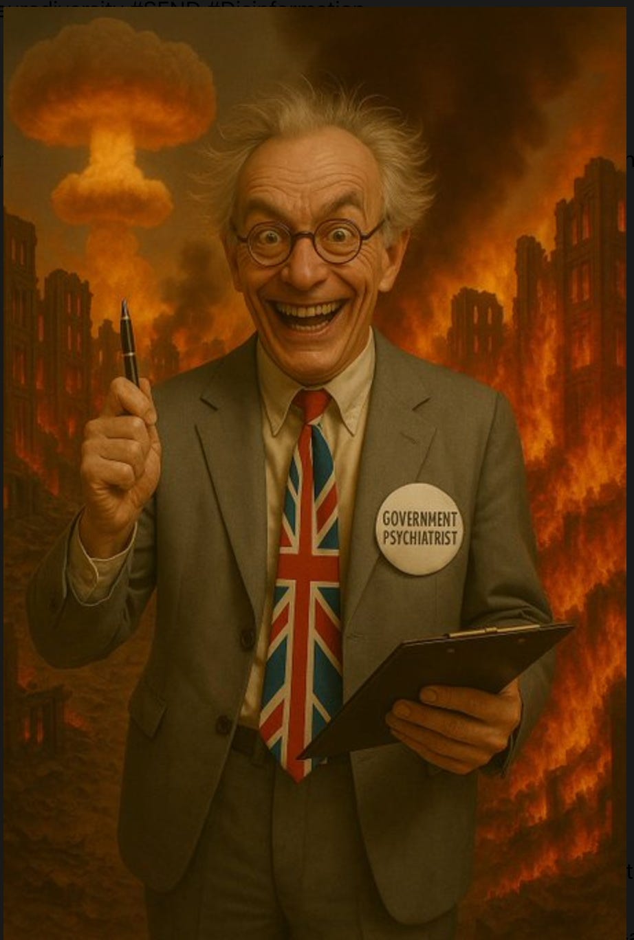 Let’s talk about the image. This “satirical” painting of a wild-eyed man in a Union Jack tie labeled Government Psychiatrist stands in front of a nuclear apocalypse.